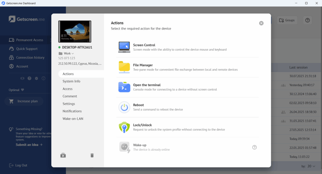 GetScreen is a remote desktop software that allows users to access and control devices through a browser without complicated setup. Unlike traditional remote access tools, it focuses on simplicity, speed, and security. This makes it particularly useful for teams that need quick access to multiple systems, such as online store administrators, developers, and support specialists.